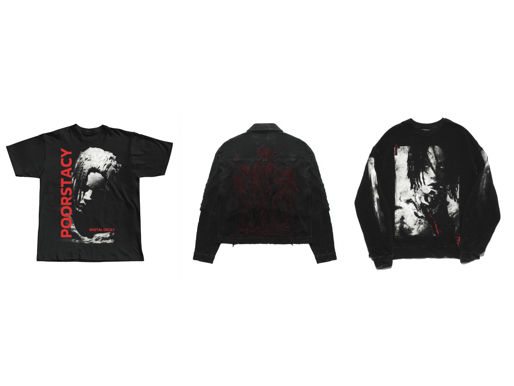 All designs were made to capture the raw, decayed digital theme of the album. This project merges clean, minimalistic product photography with grunge textures, creating a cohesive and merch-ready presentation. All imagery is made according to Poorstacy's style, made to fit in with his current music and merch drops.